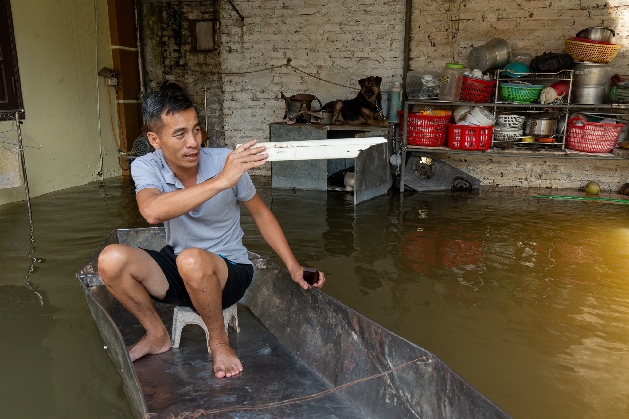 Nước lũ ngập toàn bộ xóm nhỏ, việc di chuyển trong ngõ của người dân gặp có khăn, nhiều nhà phải ra vào nơi mình sống bằng chiếc bè tự chế.