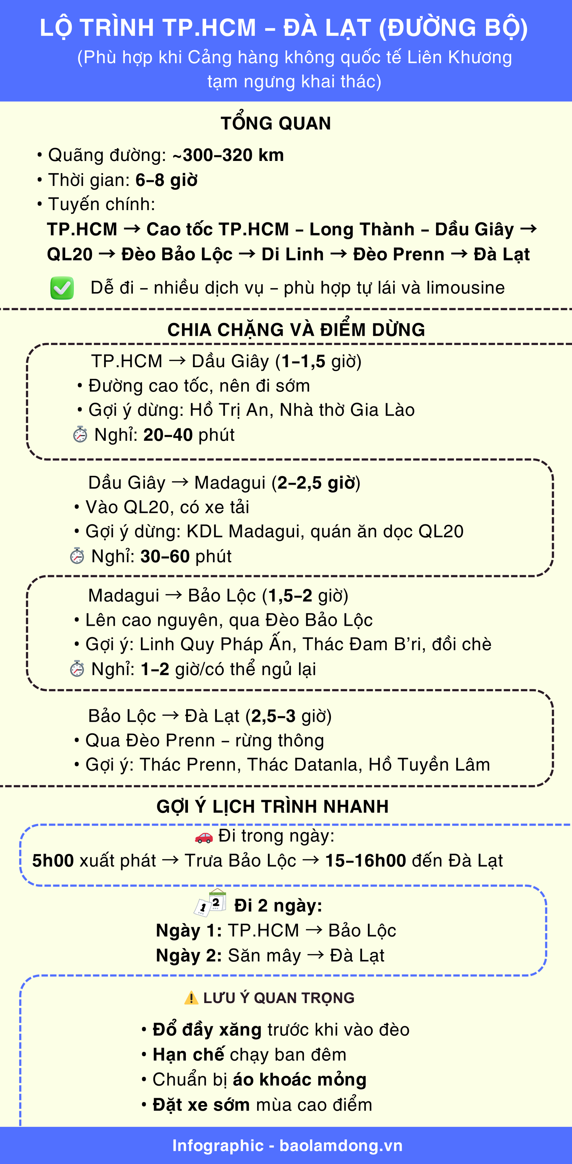 Riêng với thị trường khách từ TP. Hồ Chí Minh – nơi chiếm tỷ lệ lớn lượng du khách lên Đà Lạt – hành trình đường bộ khoảng 300 km qua Quốc lộ 20 vẫn là lựa chọn phổ biến và thuận tiện nhất.