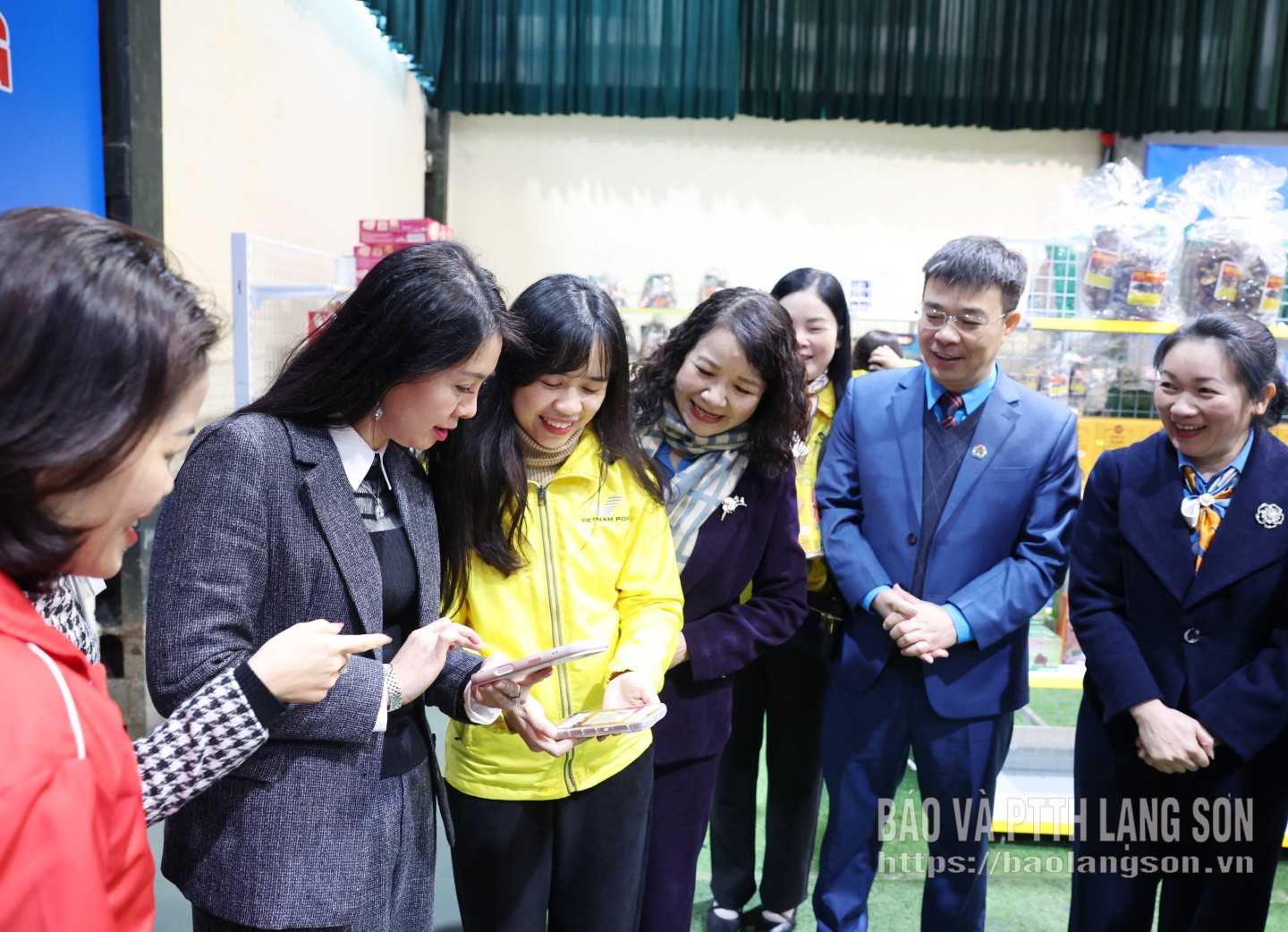 Đồng chí Đoàn Thu Hà, Phó Bí thư Tỉnh ủy, Chủ tịch Ủy ban MTTQ Việt Nam tỉnh thực hiện thanh toán không dùng tiền mặt tại các gian hàng