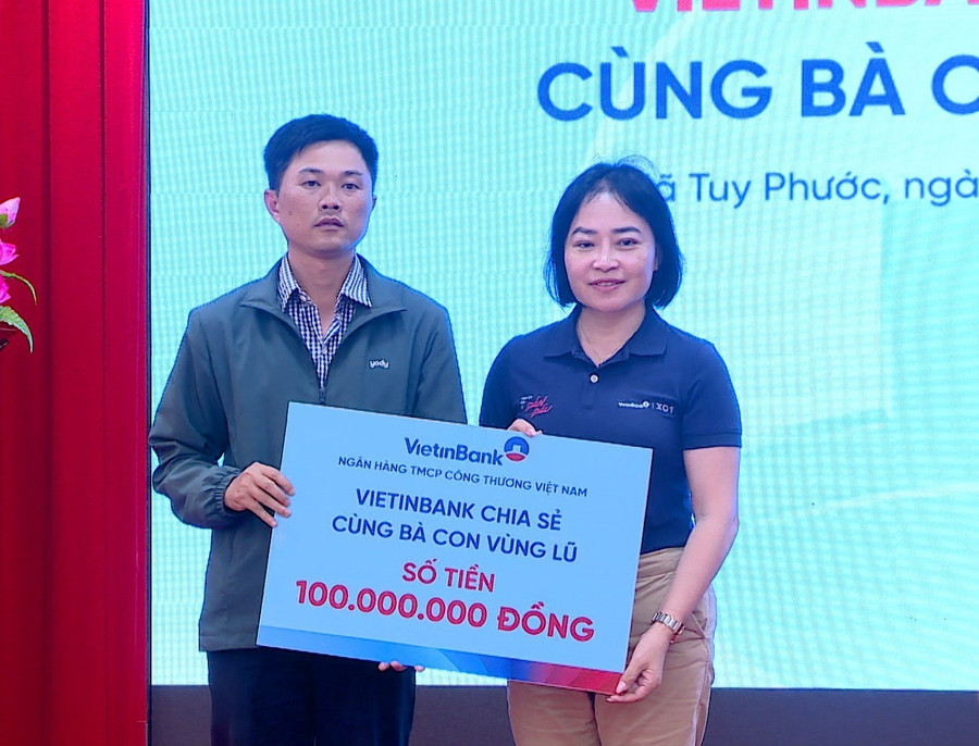 Cùng ngày, Ngân hàng TMCP Công thương Việt Nam (VietinBank) cũng trao tặng 100 suất quà (mỗi suất quà trị giá 1 triệu đồng) cho các hộ dân xã Tuy Phước bị thiệt hại nặng do bão số 13 và mưa lũ.