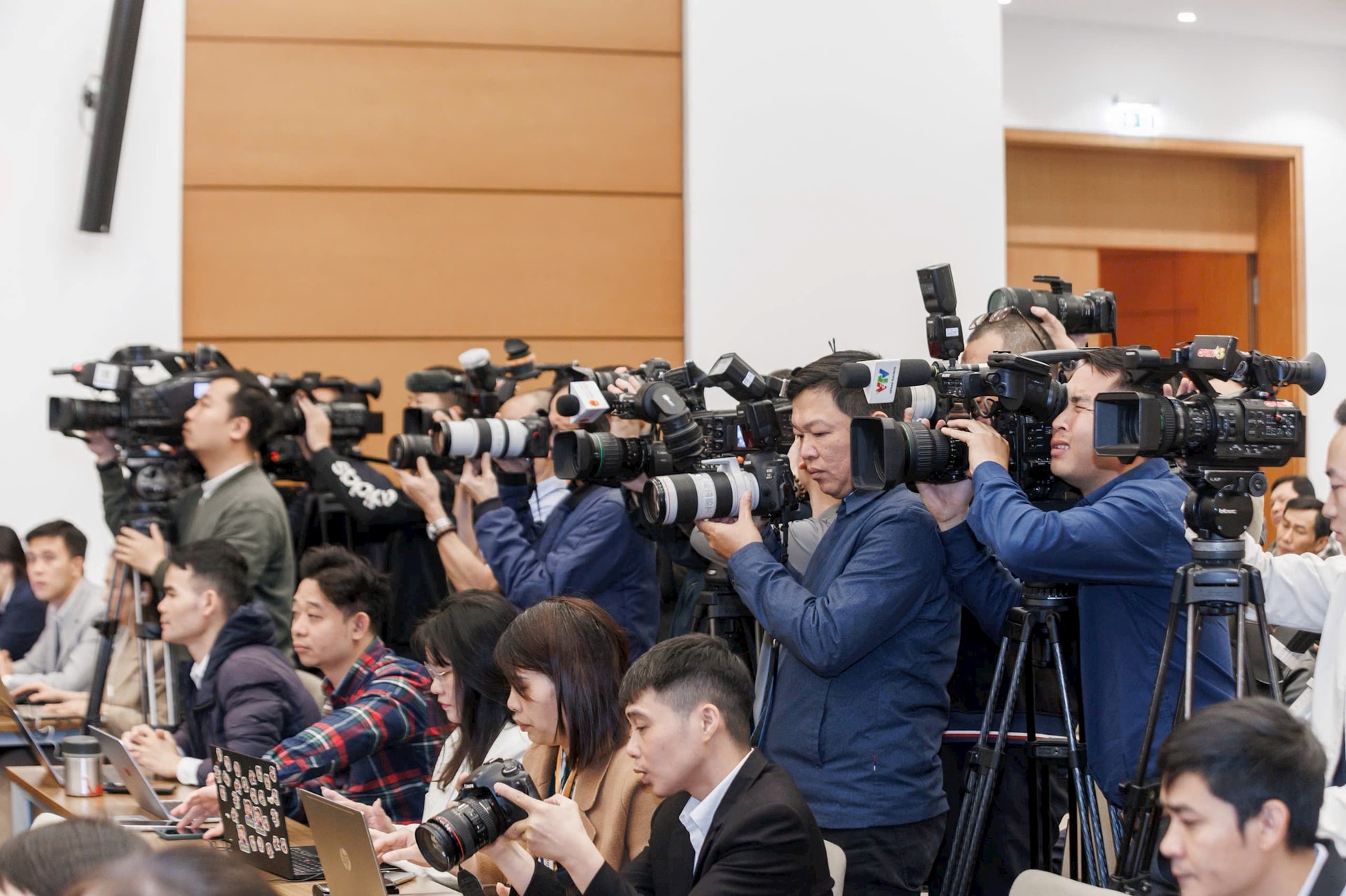 Các phóng viên, đại diện các cơ quan báo chí tham dự họp báo sáng 12-3. Ảnh: Vinh Quang