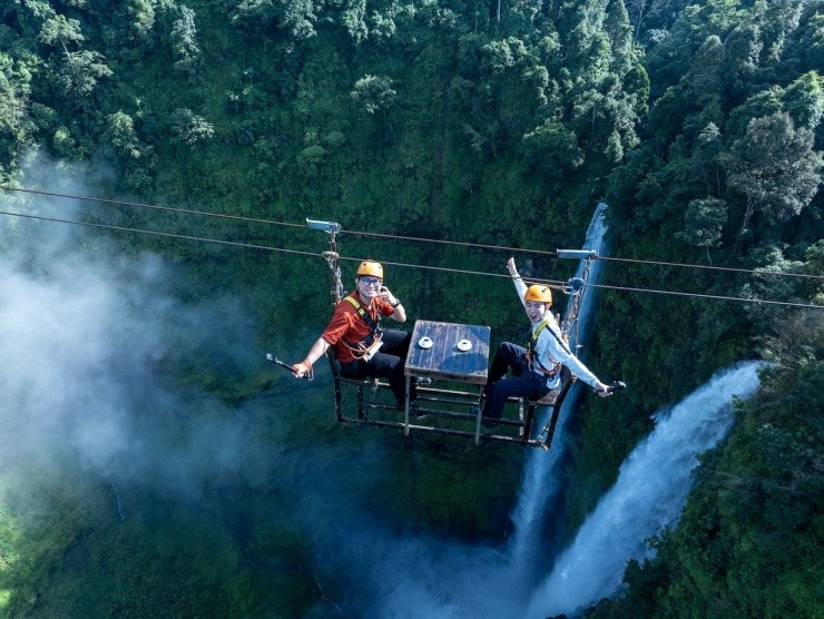 Trên cao nguyên Bolaven, thác Tad Fane cao hàng chục mét đổ xuống hẻm núi hiểm trở, nổi bật giữa rừng cây xanh ngút ngàn. Dòng thác trắng xóa tạo nên khung cảnh hùng vĩ và yên bình, là nơi lý tưởng để rời xa ồn ào thành thị. Du khách có thể ngắm thác từ các đài quan sát hoặc tận hưởng cảnh đẹp từ các resort, quán cà phê hòa mình giữa thiên nhiên. Ảnh Vũ Minh Quân
