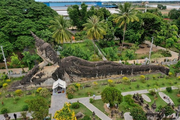 Không chỉ có thiên nhiên, Lào còn níu chân du khách bằng những công trình tâm linh đặc sắc. Vườn tượng Phật Xieng Khuan, cách trung tâm Viêng Chăn khoảng 25 km, là nơi tọa lạc của hơn 200 tượng Phật và các vị thần Hindu tinh xảo. Bức tượng Phật khổng lồ dài 40 m nằm giữa trung tâm khuôn viên, tạo không gian linh thiêng cho du khách tìm hiểu văn hóa và gửi gắm ước nguyện. Ảnh tonamcha.com