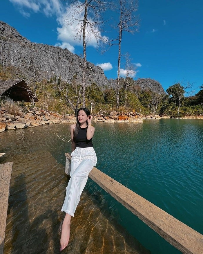Cách trung tâm Vang Vieng khoảng 7 km, Đầm Blue Lagoon là quần thể đầm xanh trong vắt, nằm giữa núi đồi xanh mướt. Du khách có thể di chuyển bằng xe tuk tuk, xe đạp hoặc phương tiện công cộng để chiêm ngưỡng cảnh sắc tuyệt đẹp. Địa hình độc đáo của Blue Lagoon còn tạo điều kiện cho các trò chơi mạo hiểm như nhảy nhào lộn từ ghế treo, zipline hay đu dây vượt thác. Trước khi đến đầm, du khách còn có thể khám phá quần thể động Poukham kỳ bí giữa sông núi hài hòa. Ảnh Luhanhvietnam