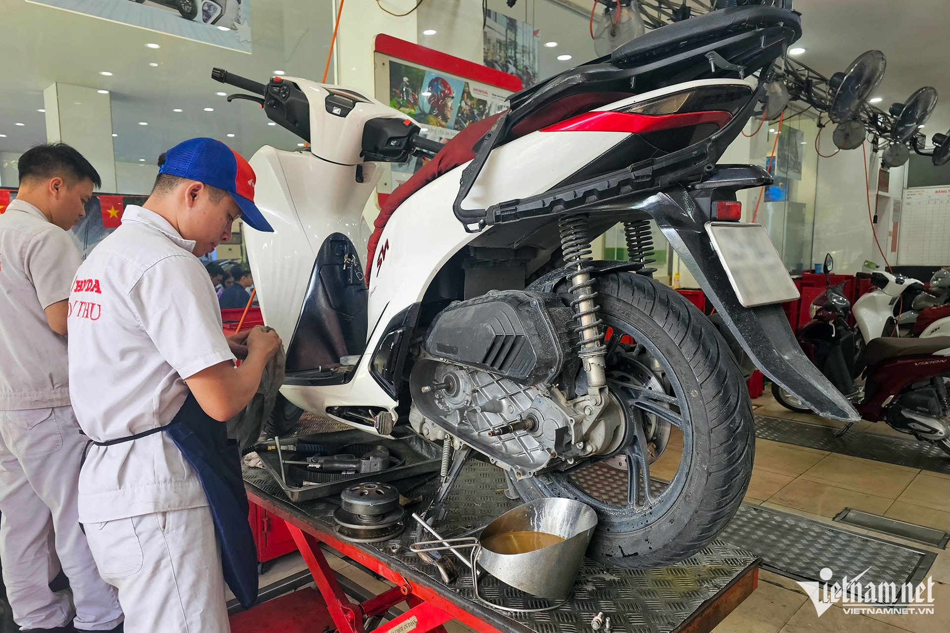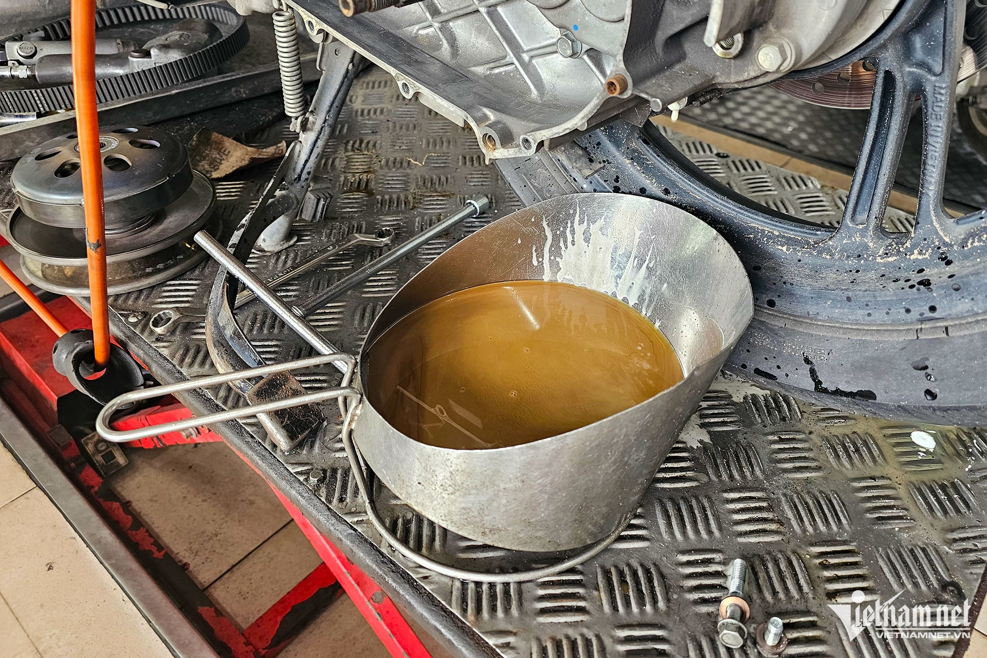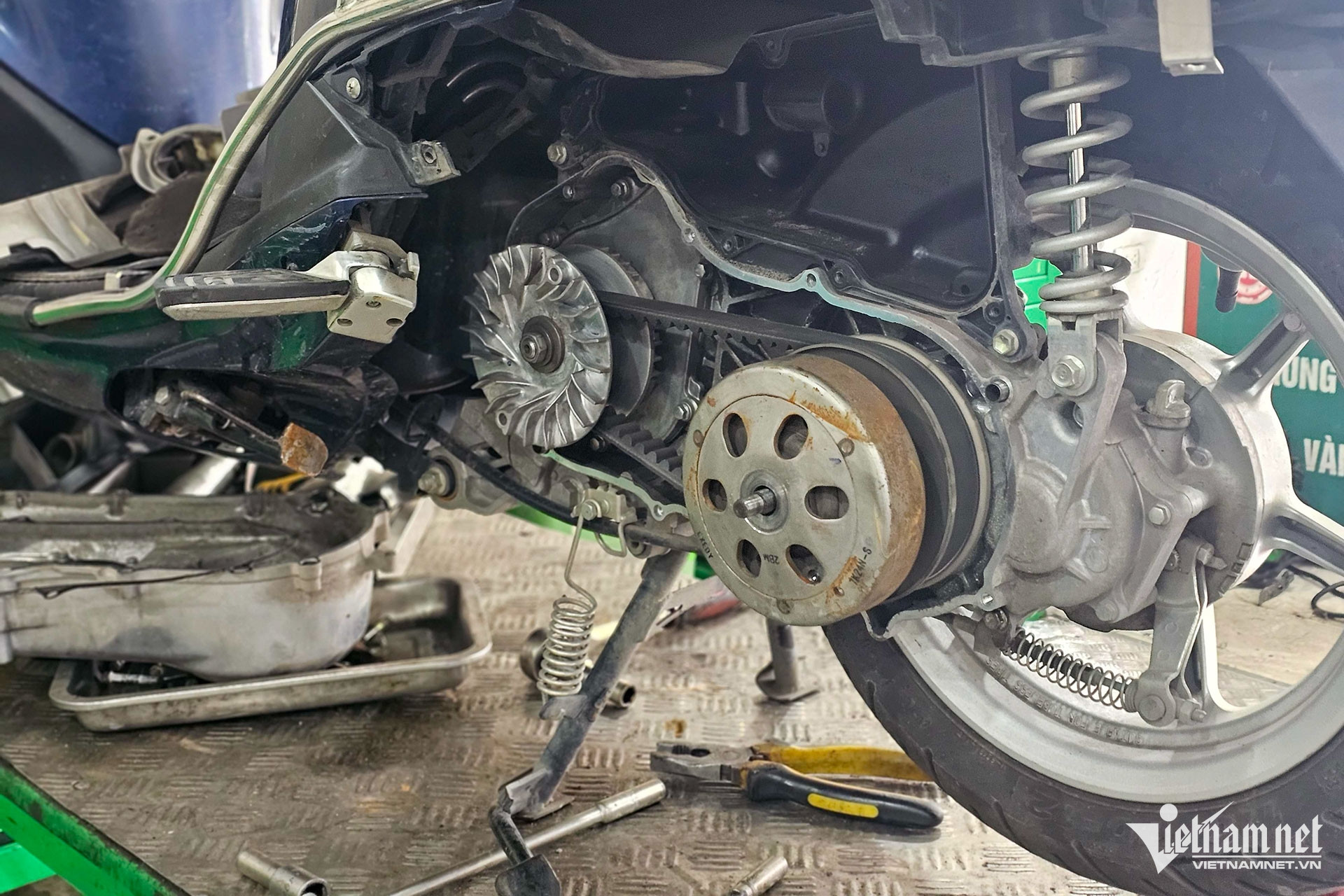 Một chiếc xe tay ga đang được vệ sinh toàn bộ hệ thống truyền động và thay dầu láp. Ảnh: Ngô Minh