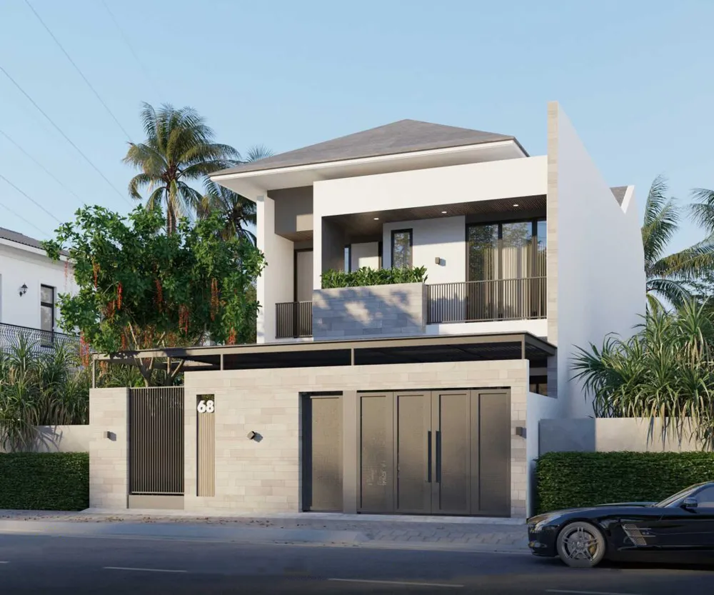Các mẫu cổng phổ biến cho nhà hai tầng thường có trụ cổng lớn, vuông vức. Các cột trụ có thể được ốp bằng đá tự nhiên hoặc sơn giả đá nhằm gia tăng giá trị thẩm mỹ và độ bền cho công trình.