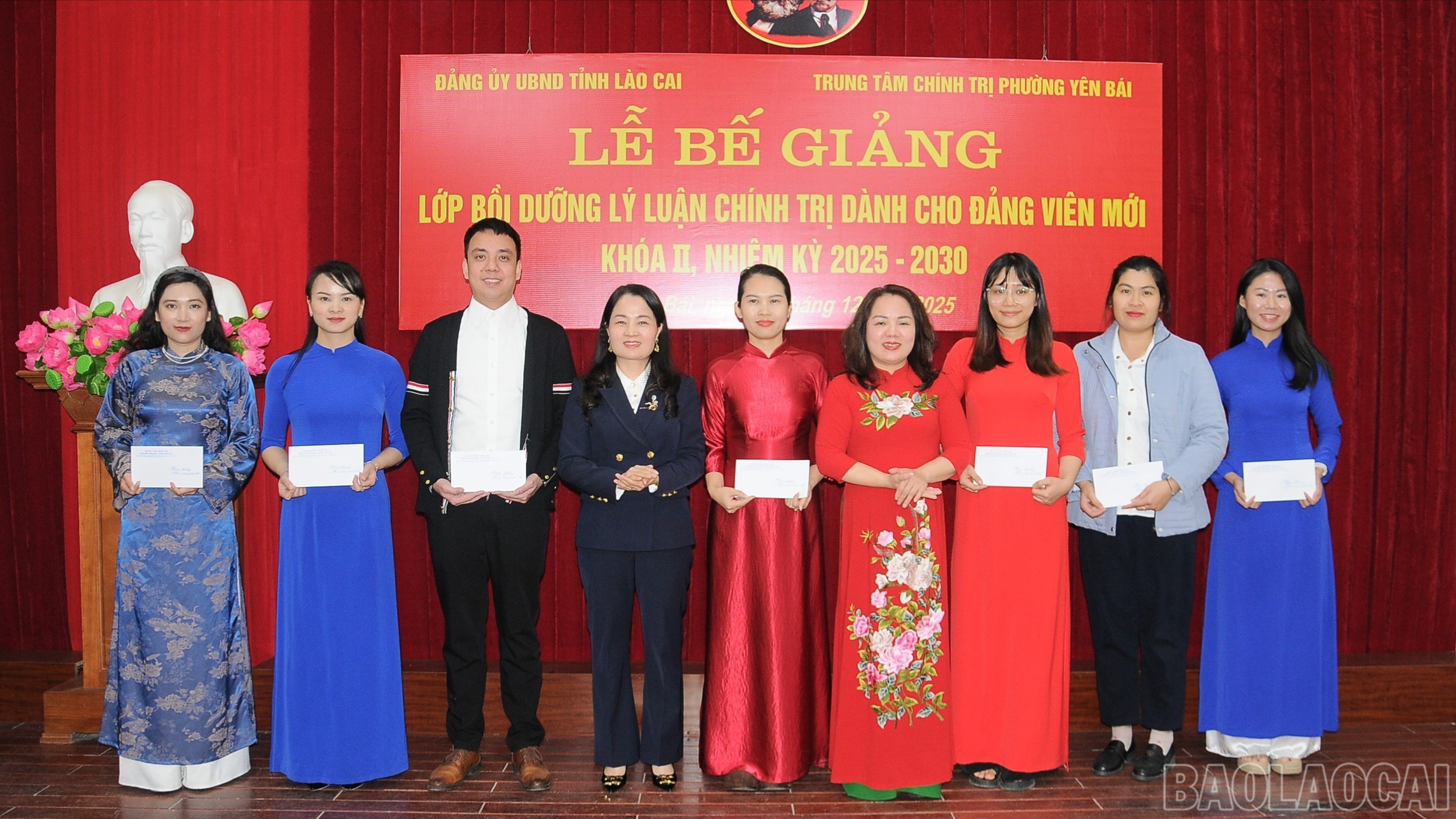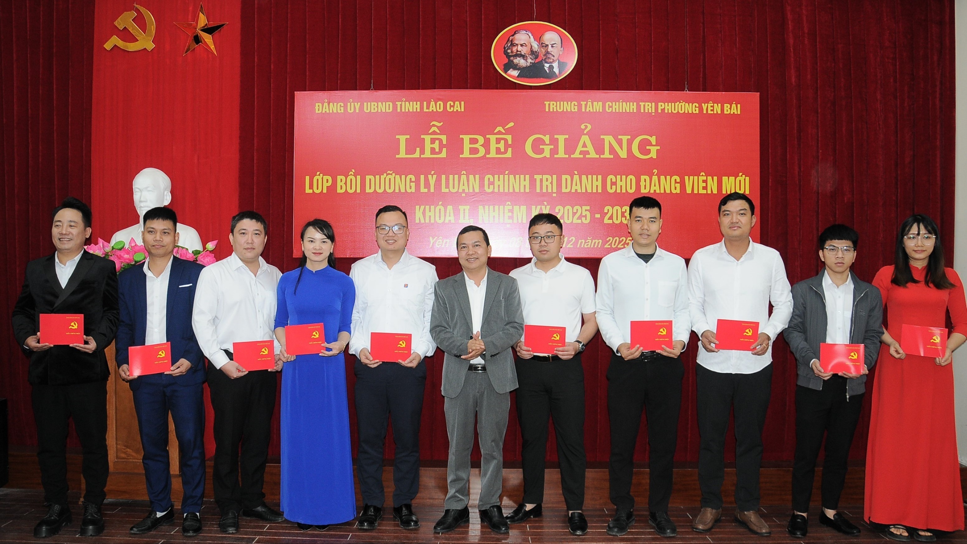 Lãnh đạo Đảng ủy UBND tỉnh và lãnh đạo Trung tâm Chính trị phường Yên Bái trao phần thưởng cho các học viên xuất sắc.