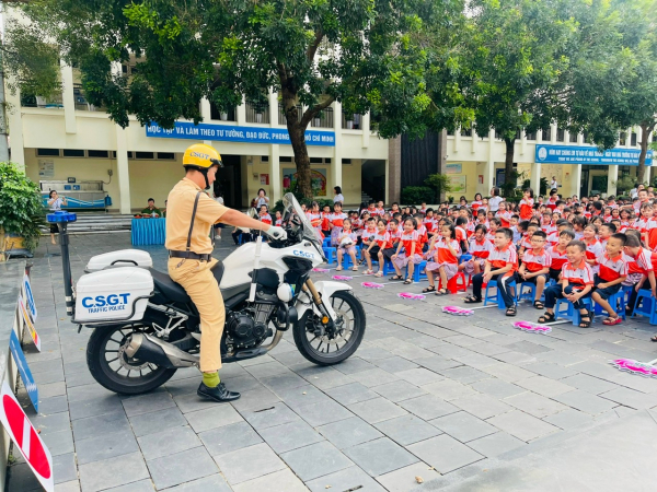 Cán bộ Công an hướng dẫn các cháu học sinh tham gia giao thông an toàn.