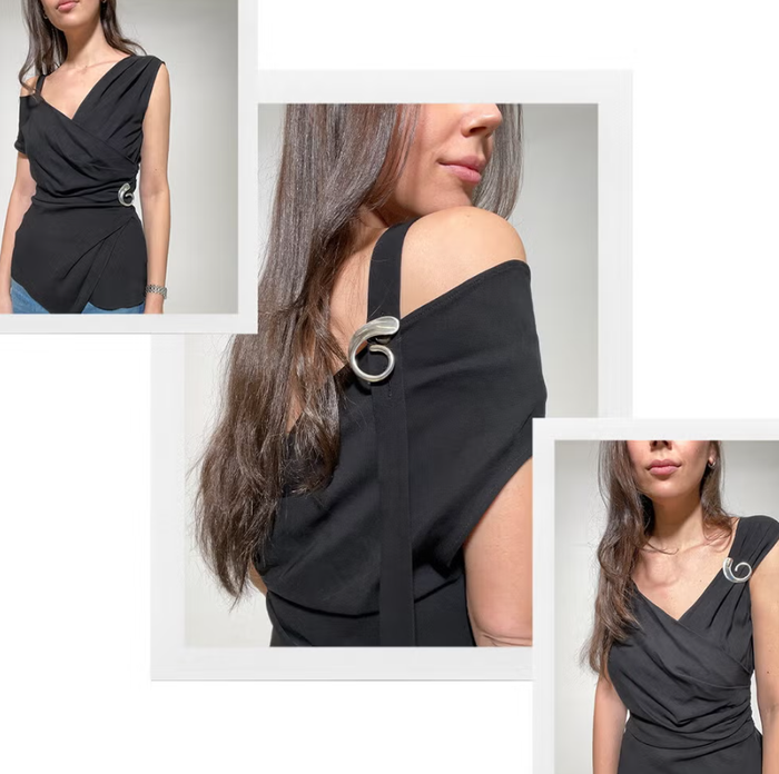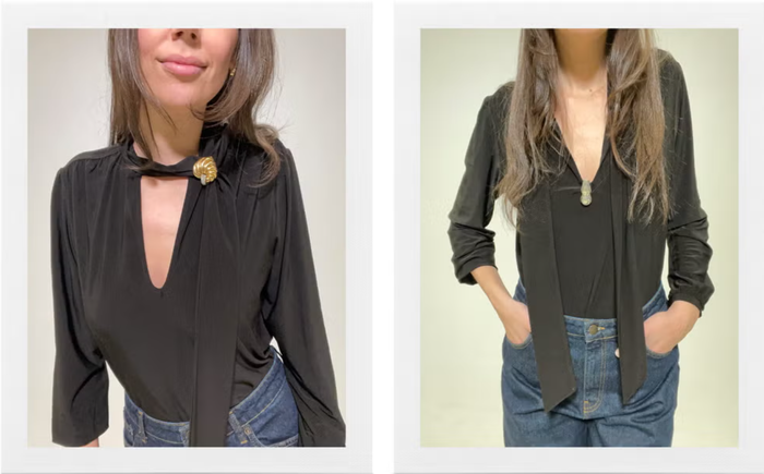 Thay vì đeo vòng cổ quen thuộc, một chiếc trâm cài áo có thể trở thành điểm nhấn nổi bật cho trang phục. Với những mẫu áo có thiết kế cầu kỳ, một chiếc trâm kim loại tối giản hoặc mang kiểu dáng điêu khắc sẽ giúp tổng thể trông tinh tế hơn mà không làm rối mắt.
