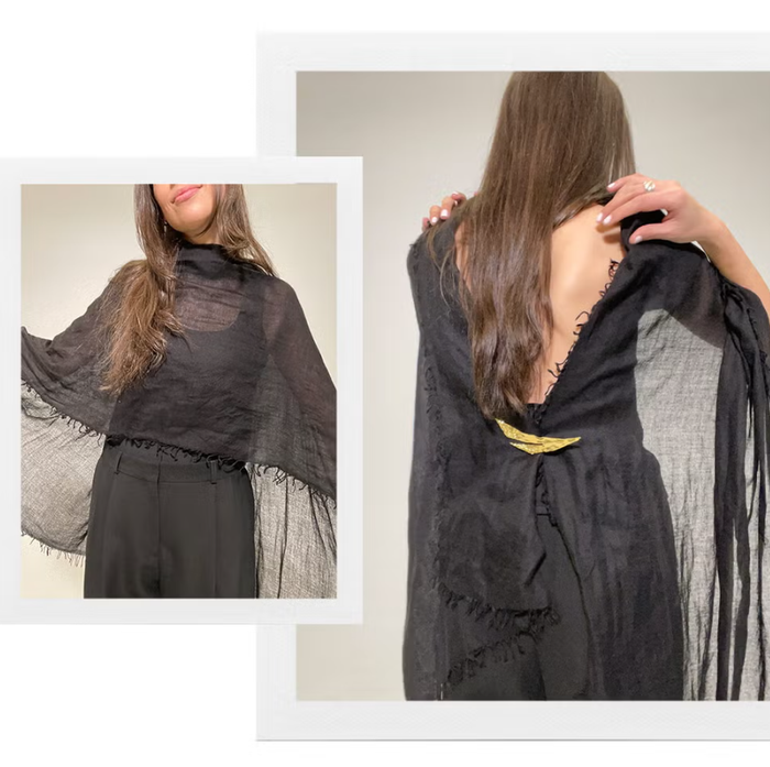 Một chiếc khăn choàng mỏng có thể biến tấu thành áo choàng độc đáo khi mặc ngược ra phía sau. Cách phối này đặc biệt phù hợp với những sự kiện trang trọng.