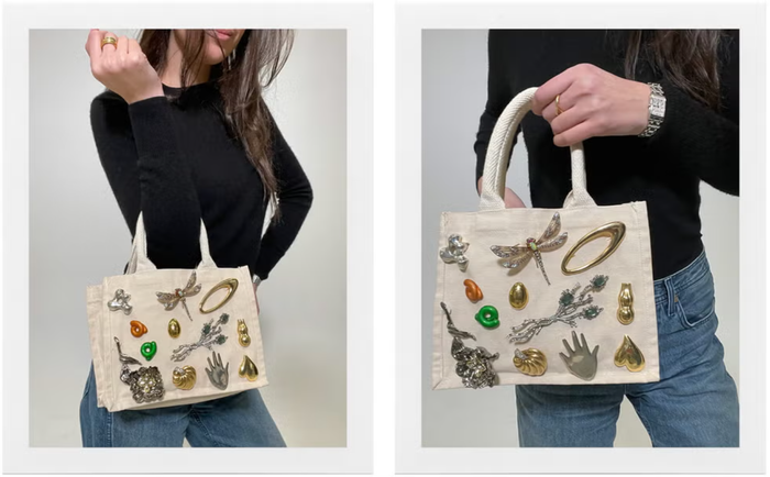 Việc kết hợp nhiều chiếc trâm trên cùng một món đồ, chẳng hạn như túi xách nhỏ, sẽ tạo hiệu ứng thị giác ấn tượng. Khi phối, có thể thay đổi kích thước, kiểu dáng và chất liệu để tổng thể thêm sinh động. Quy tắc duy nhất là: càng nhiều càng nổi bật.