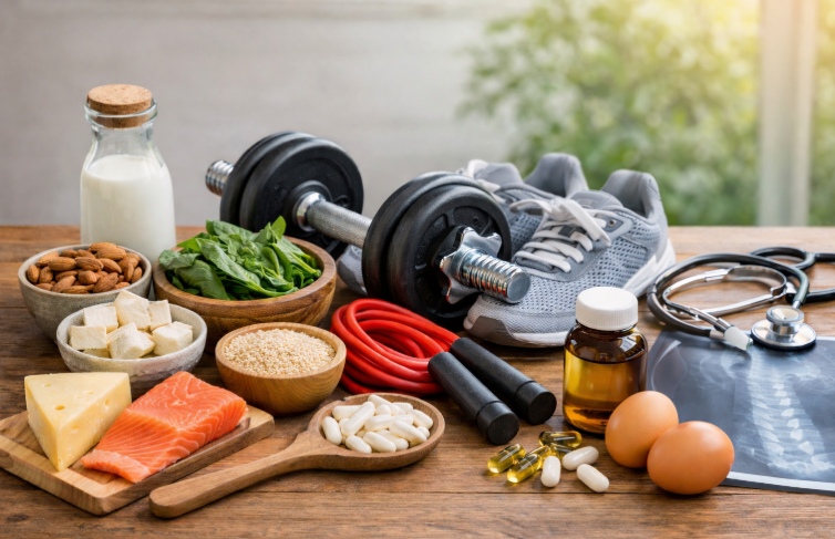 Các thực phẩm giàu canxi, protein cùng dụng cụ tập luyện minh họa những yếu tố quan trọng giúp duy trì mật độ xương và hỗ trợ xương chắc khỏe.