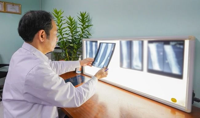 TS.BS Hoàng Hải Đức đánh giá tổn thương ung thư sụn trước phẫu thuật. Ảnh: BVCC