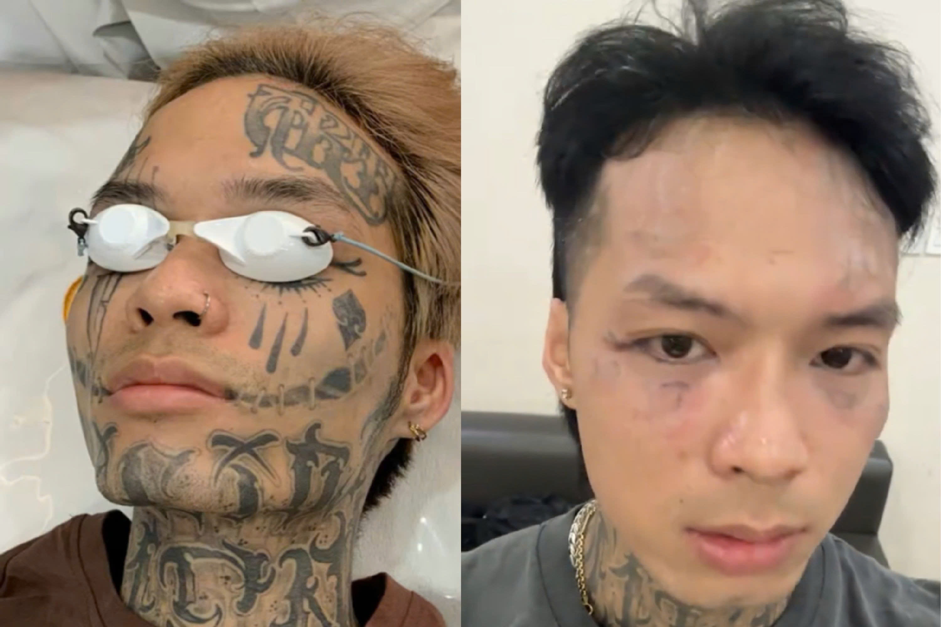 Trương Hạnh Phúc trước và sau khi xóa hình xăm trên mặt.