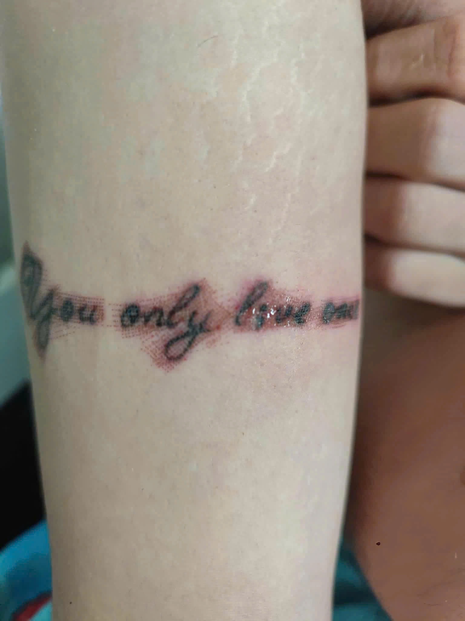 Nguyễn Trung Đạt (19 tuổi, TP.HCM) từng xăm dòng chữ “You only live once” (dịch: bạn chỉ sống một lần) để nhắc nhở bản thân không bỏ cuộc trước những khó khăn trong cuộc sống. Nhưng hiện tại, hình xăm không phù hợp với môi trường công việc mới anh dự định theo đuổi.