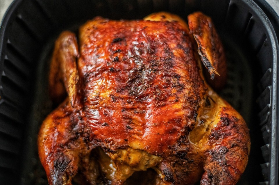 Bạn có thể tìm thấy nhiều công thức nấu gà nguyên con bằng nồi chiên không dầu trên mạng, nhưng đây là cách không nên làm. Vì nồi chiên không dầu sử dụng nhiệt đối lưu nên da gà sẽ chín nhanh hơn bên trong.