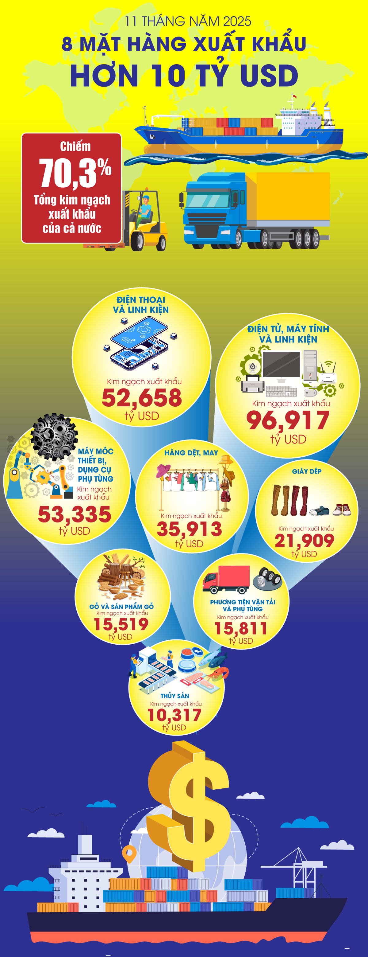 8 mặt hàng xuất khẩu trên 10 tỷ USD trong 11 tháng năm 2025