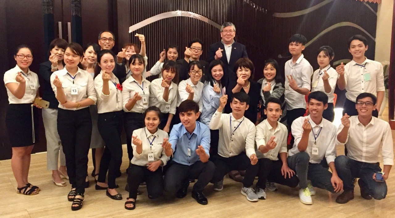 Tấn Tài (hàng dưới, thứ 2 từ phải sang) chụp ảnh lưu niệm cùng các đồng nghiệp tại Nhật Bản
