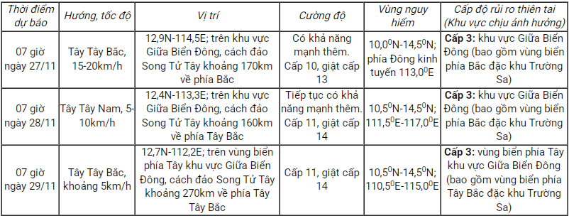 Cảnh báo đỉnh điểm (ngày 27 - 28.11): Khu vực Giữa Biển Đông (bao gồm vùng biển phía bắc đặc khu Trường Sa) có khả năng chịu tác động trực tiếp của gió mạnh lên tới cấp 11, giật cấp 14. Sóng biển cao đạt mức 7 - 9m, biển động dữ dội.