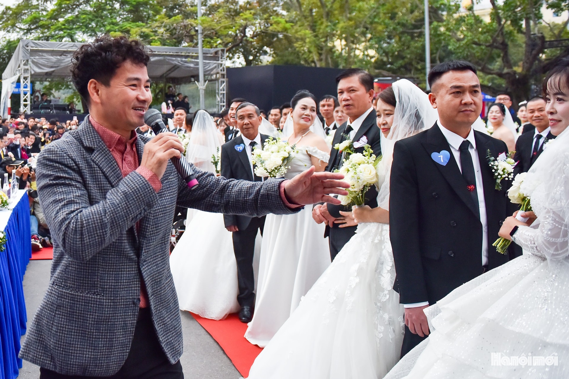 Cục trưởng Cục Nghệ thuật biểu diễn Nguyễn Xuân Bắc hào hứng hòa mình vào không khí lễ cưới, chia sẻ niềm vui cùng các cặp đôi trong đám cưới tập thể.