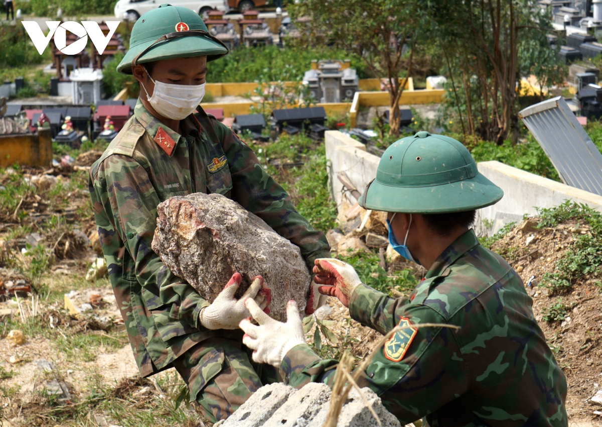 Bội đội Quân khu 5 sửa chữa các phần mộ bị sụt trượt, vùi lấp tại nghĩa trang Hòa Sơn (Đà Nẵng) do ảnh hưởng mưa lũ năm 2022
