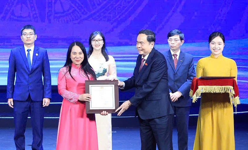Chủ tịch Quốc hội Trần Thanh Mẫn trao giải A cho tác giả Nguyễn Thị Hạnh. Ảnh: Phạm Thắng