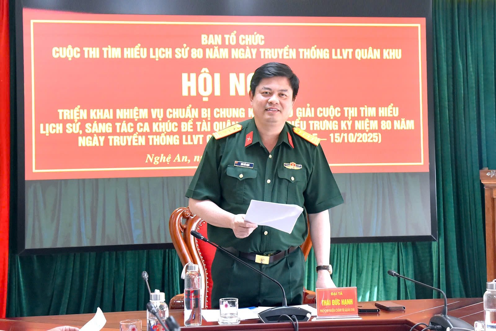 Đại tá Thái Đức Hạnh - Phó Chủ nhiệm Chính trị Quân khu - Trưởng ban tổ chức Cuộc thi phát biểu chỉ đạo Hội nghị triển khai nhiệm vụ chuẩn bị chung kết Cuộc thi tìm hiểu lịch sử 80 năm Ngày truyền thống LLVT Quân khu 4.