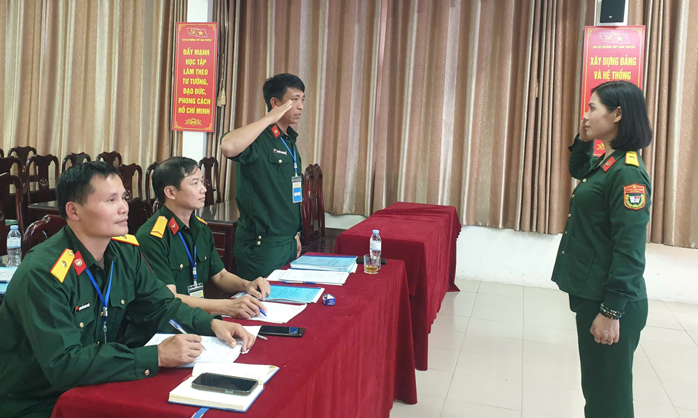 Giáo viên dự thi môn Giáo dục Quốc phòng và An ninh nghe Ban giám khảo phổ biến các nội dung thi tại điểm thi Trường Trung học phổ thông Hàn Thuyên, phường Võ Cường (chiều 5/3).