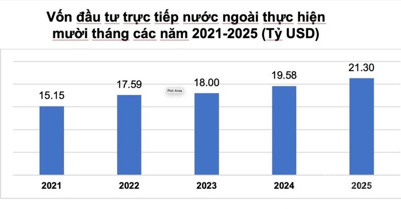 Vốn đầu tư trực tiếp nước ngoài thực hiện tại Việt Nam 10 tháng năm 2025 ước đạt 21,3 tỷ USD, tăng 8,8% so với cùng kỳ năm trước.
