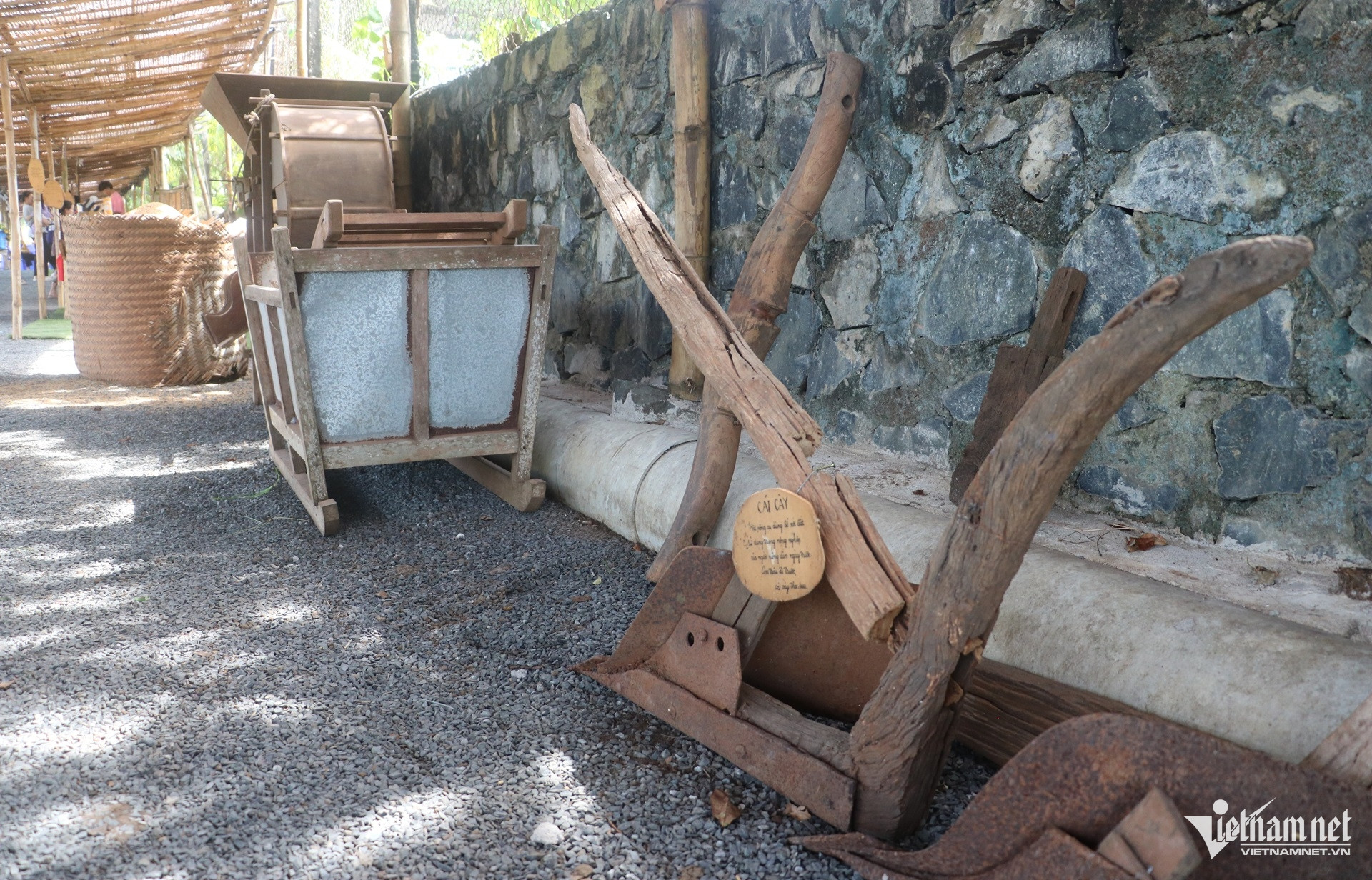 Anh còn dựng lên dãy nhà tre nứa giản dị để trưng bày các nông cụ xưa như bồ lúa, cái cày, máy sàng gạo cùng bộ sưu tập vật dụng từ thời nhà Nguyễn: giỏ mai cài thọ, nghiên mực, bàn là, chén bát... giúp tái hiện hình ảnh làng quê ngày trước.
