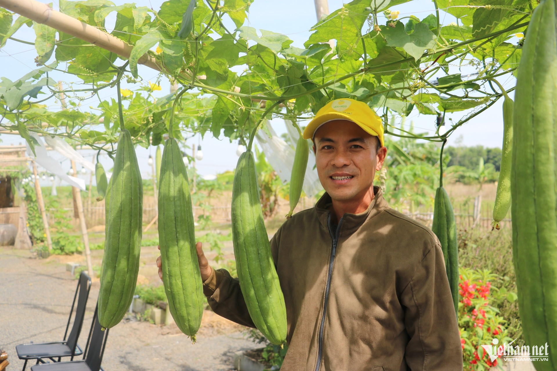 Anh Hiếu bên giàn mướp đã đến lúc thu hoạch, sau thời gian cần mẫn chăm sóc. Ảnh: Quang Hưng
