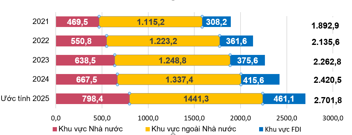 Trong số trên, vốn khu vực nhà nước đạt 798,4 nghìn tỷ đồng, chiếm 29,6% tổng vốn và tăng 19,6% so với cùng kỳ năm trước; khu vực ngoài nhà nước đạt 1.441,3 nghìn tỷ đồng, chiếm 53,3% và tăng 7,8%; khu vực có vốn đầu tư trực tiếp nước ngoài đạt 462,1 nghìn tỷ đồng, chiếm 17,1% và tăng 11,2%.