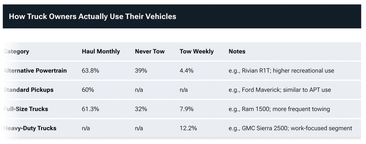 Nghiên cứu cũng chỉ ra rằng các mẫu xe bán tải cỡ nhỏ, xe “lifestyle pickup” và dòng bán tải điện hoặc hybrid là nhóm ít được sử dụng đúng công năng nhất. Chỉ khoảng 39% chủ xe trong nhóm này từng kéo rơ-moóc hoặc chở hàng nặng, trong khi tỷ lệ này ở xe bán tải cỡ lớn chỉ đạt 32%.