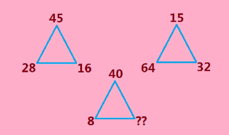 Trong hình ảnh, hai tam giác phía trên có đầy đủ các con số ở ba đỉnh, còn tam giác phía dưới lại để trống một giá trị với dấu “??”. Nhiệm vụ của người chơi là quan sát mối liên hệ giữa các con số trong từng tam giác để suy ra quy luật chung.