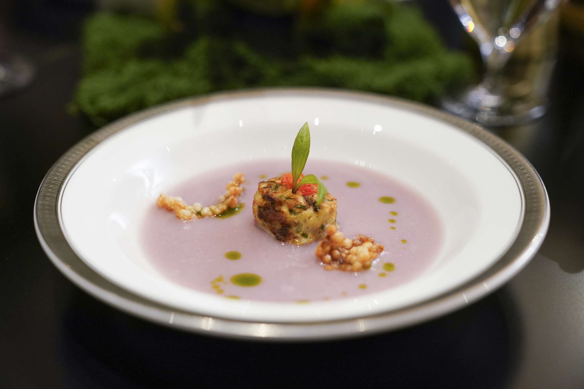 Súp khoai mỡ, rau mần tưới xuất hiện trong set menu tại nhà hàng 5 sao. Ảnh: Linh Huỳnh.