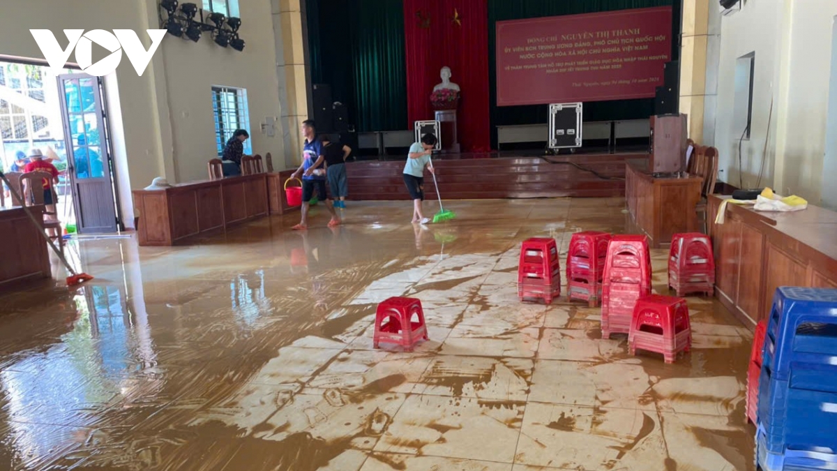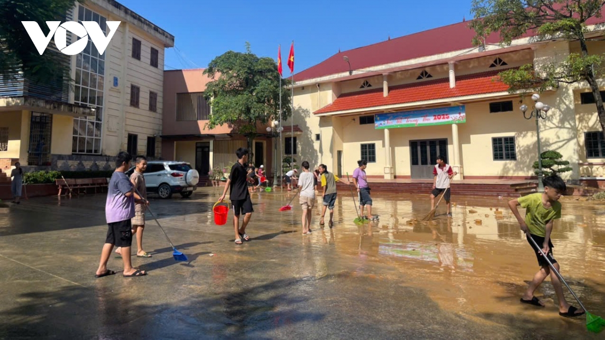Sau 3 ngày nước lũ tạm rút, các cô ngoài việc chăm, dạy học sinh thì kiêm thêm việc thau rửa đồ đạc, nền nhà, tẩy rửa bùn đất làm vệ sinh để các con có chỗ vui chơi, sinh hoạt