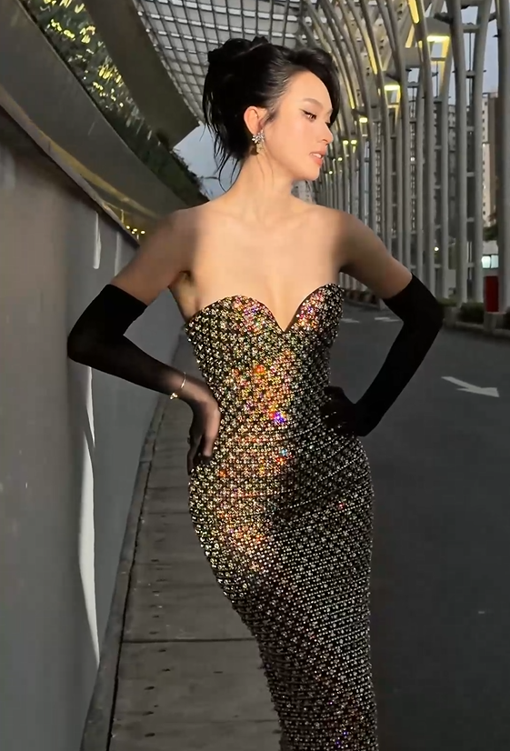 Người đẹp diện thiết kế váy dáng dài, phủ kín toàn thân với chất liệu đính kết dày đặc giúp tôn trọn đường cong cơ thể, đồng thời mang đến diện mạo vừa quyến rũ vừa sang trọng. Phần cúp ngực khéo léo khoe bờ vai và vòng một đầy đặn, trong khi đường cắt gọn gàng ôm sát vóc dáng giúp Á hậu sinh năm 1998 khoe triệt để lợi thế hình thể. Cô hoàn thiện tổng thể bằng kiểu tóc búi cao, lối trang điểm sắc sảo cùng găng tay dài, tạo điểm nhấn mang hơi hướng cổ điển trên thảm đỏ.