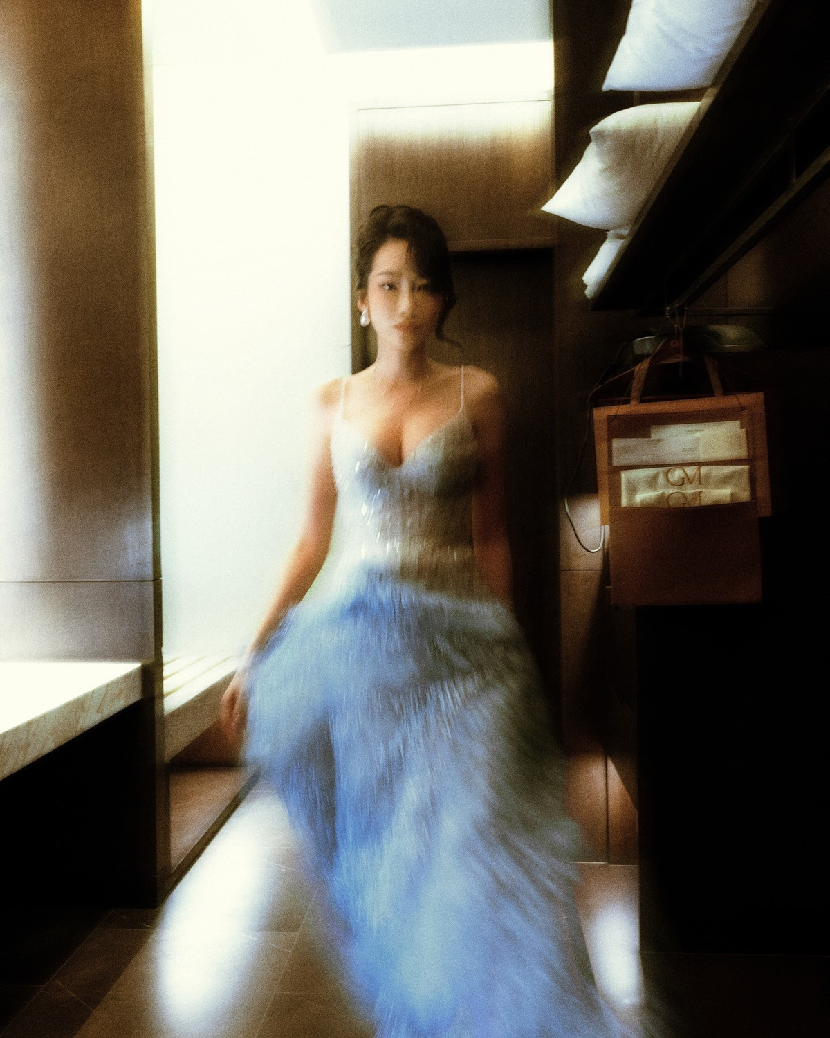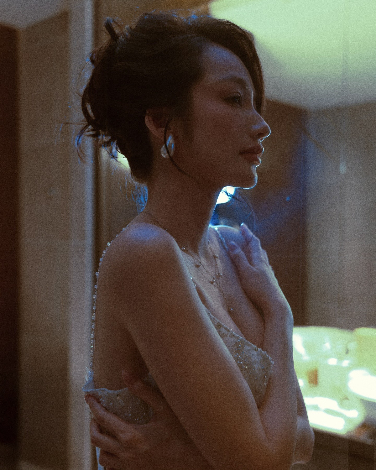 Người đẹp chọn kiểu tóc búi cao gọn gàng, giúp tôn trọn bờ vai gầy thanh mảnh cùng phần xương quai xanh.