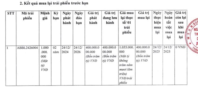 Ngân hàng đã thực hiện mua lại toàn bộ 200 trái phiếu mã ABBL2426002 vào ngày 28/11/2025, với giá trị mua lại thực tế là 1,055 tỷ đồng/trái phiếu; tương ứng 211 tỷ đồng/lô. Giao dịch được hoàn tất trong cùng ngày. Lô trái phiếu ABBL2426002 phát hành ngày 28/11/2024, có mệnh giá 1 tỷ đồng/trái phiếu, tổng giá trị phát hành 200 tỷ đồng; kỳ hạn 2 năm, ngày đáo hạn theo lịch ban đầu là 28/11/2026. Như vậy, ABBank đã tất toán lô ABBL2426002 chỉ sau 1 năm phát hành.