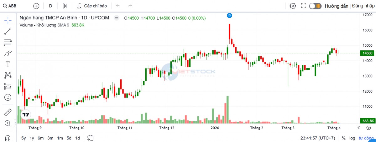 Trên thị trường chứng khoán, chốt phiên giao dịch ngày 3/4, cổ phiếu ABB đóng cửa tại 14.500 đồng, giữ nguyên so với phiên trước đó (2/4) sau khi đã giảm mạnh 2,03% ở phiên liền trước. Thanh khoản giảm đáng kể, với khối lượng khớp lệnh chỉ đạt 663.800 cổ phiếu, thấp hơn nhiều so với mức gần 1,88 triệu đơn vị của ngày 2/4, giao dịch khối ngoại không phát sinh trong phiên này, trong khi phiên trước ghi nhận mua vào 224.000 cổ phiếu.
