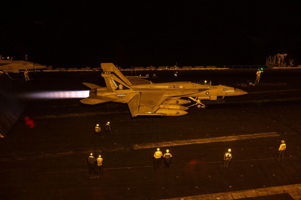 Một máy bay Mỹ cất cánh từ boong tàu USS Dwight Eisenhower trong chiến dịch chống lại lực lượng Houthi hồi tháng 3/2025. Ảnh: Bloomberg.