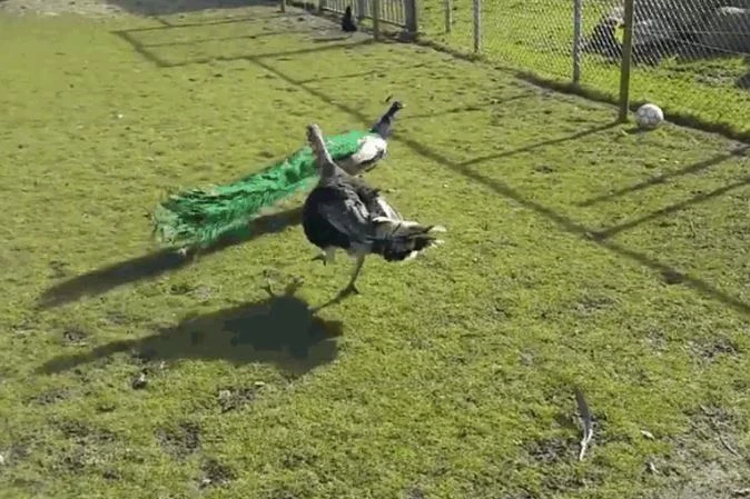 Sau vài phút giằng co, gà tây bất ngờ tung đòn quyết định, buộc đối thủ phải “bỏ chạy mất dép”. Con công hoảng hốt bay thẳng lên cao để thoát thân, khép lại màn “ác chiến” với phần thắng nghiêng về gà tây.