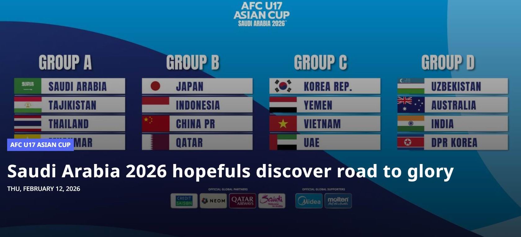 VCK U-17 châu Á 2026 khai diễn đầu tháng 5 tại Saudi Arabia, cũng là vòng loại World Cup U-17 cùng năm tại Qatar. Liên đoàn bóng đá châu Á (AFC) chưa lên tiếng, trong chỉ còn khoảng 1,5 tháng nữa là khai mạc, các đội trẻ, trong đó có U-17 Việt Nam đang bị động khi thời gian đến giải không còn nhiều.