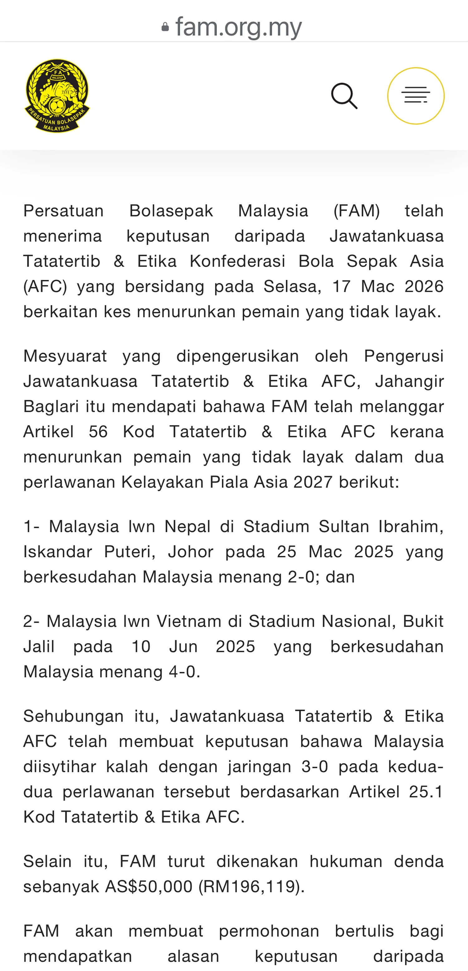 Cuộc họp do Chủ tịch Ban Kỷ luật & Đạo đức AFC Jahangir Baglari chủ trì, đã kết luận rằng FAM vi phạm Điều 56 Bộ quy tắc Kỷ luật & Đạo đức AFC vì đã đưa vào sân cầu thủ không đủ điều kiện trong hai trận đấu thuộc Vòng loại Asian Cup 2027 giữa Malaysia gặp Nepal (ngày 25-3-2025) và trận Malaysia gặp Việt Nam (ngày 10-6-2025).