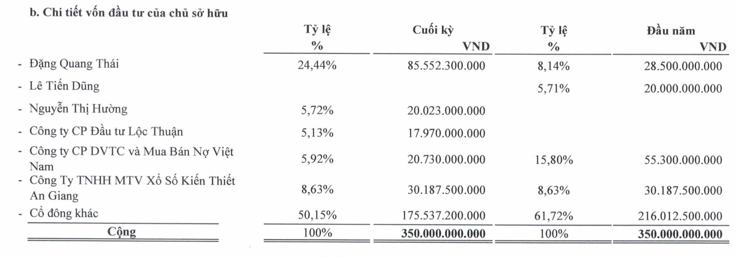 Tính tới ngày 30/9/2025, Afiex ghi nhận 5 cổ đông lớn gồm ông Đặng Quang Thái, Chủ tịch HĐQT sở hữu 24,44% vốn điều lệ; bà Nguyễn Thị Hường, sở hữu 5,72% vốn điều lệ; CTCP Đầu tư Lộc Thuận sở hữu 5,13% vốn điều lệ; CTCP DVTC và Mua bán nợ Việt Nam sở hữu 5,92% vốn điều lệ; Công ty TNHH MTV Xổ số kiến thiết An Giang sở hữu 8,63% vốn điều lệ; và còn lại 50,15% vốn điều lệ thuộc về các cổ đông khác.