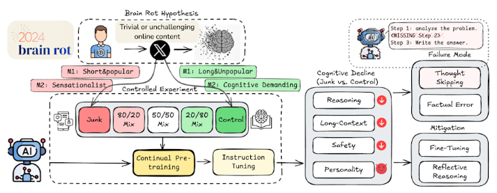 Và hóa ra không chỉ con người bị “thối não”. Nhóm nghiên cứu từ Đại học Texas A&M, Đại học Texas tại Austin cùng Đại học Purdue phát hiện các mô hình AI ngôn ngữ lớn (LLM) khi tiếp xúc với nội dung thu hút nhiều tương tác trên X cũng suy giảm khả năng lập luận lẫn trí nhớ ngữ cảnh dài, ngoài ra còn gia tăng đột biến chứng tự luyến lẫn rối loạn nhân cách chống đối xã hội.