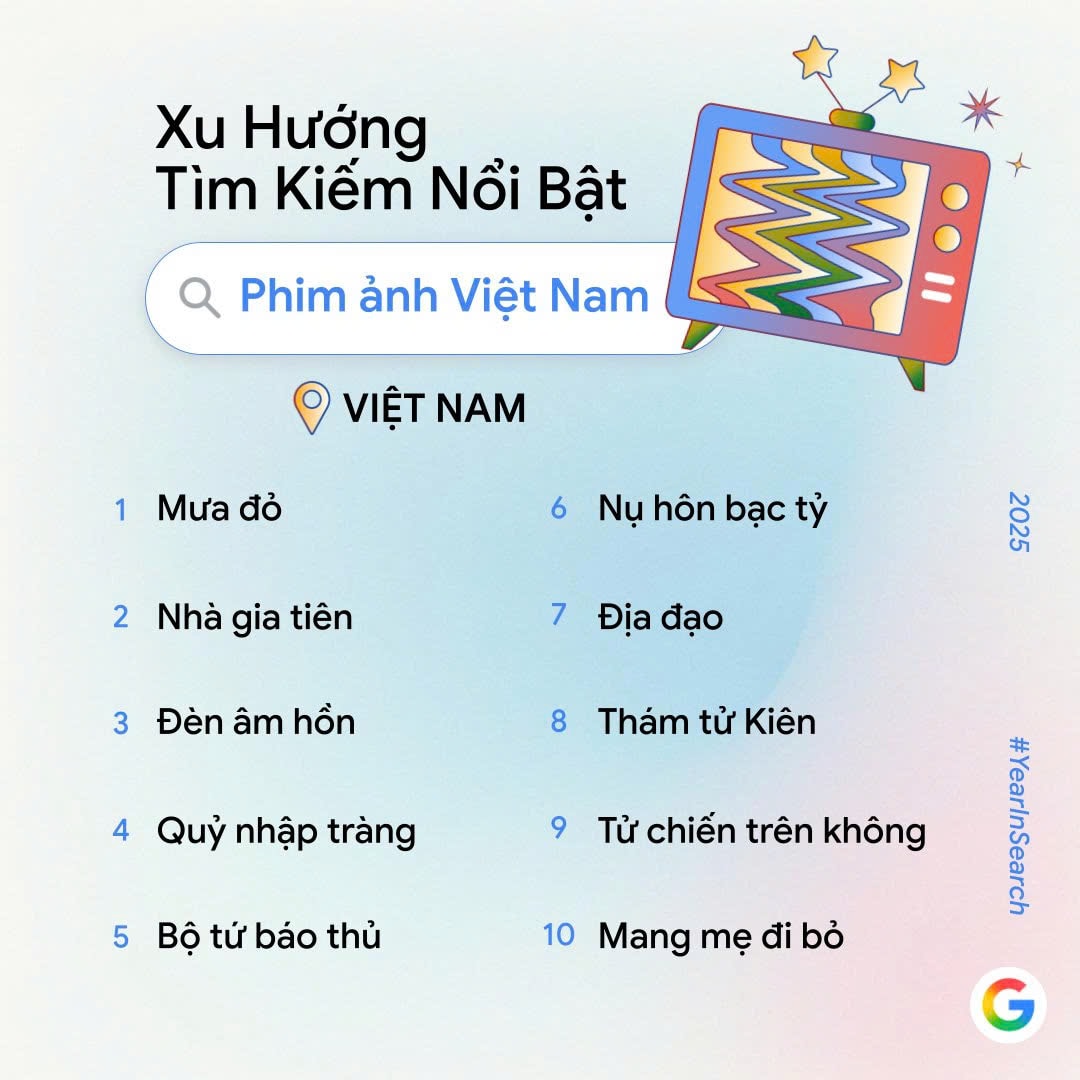 Không chỉ công nghệ, văn hóa - giải trí cũng lên ngôi mạnh mẽ. Trong bảng xếp hạng tìm kiếm 2025, phim Việt như Mưa đỏ xuất hiện trong top “Xu hướng chung”, top “Phim ảnh chung” và “Phim ảnh Việt Nam” - minh chứng cho sức hút mạnh mẽ của nội dung Việt.