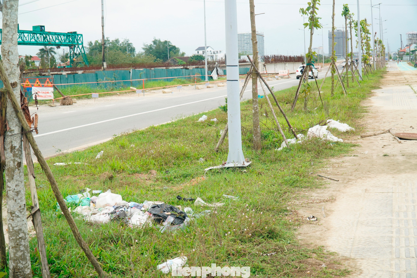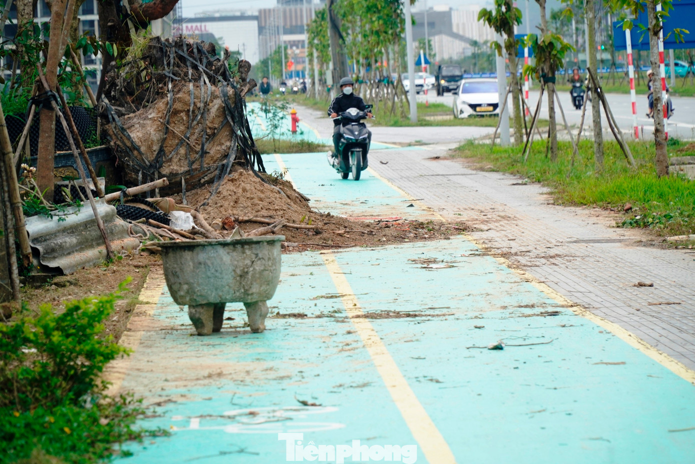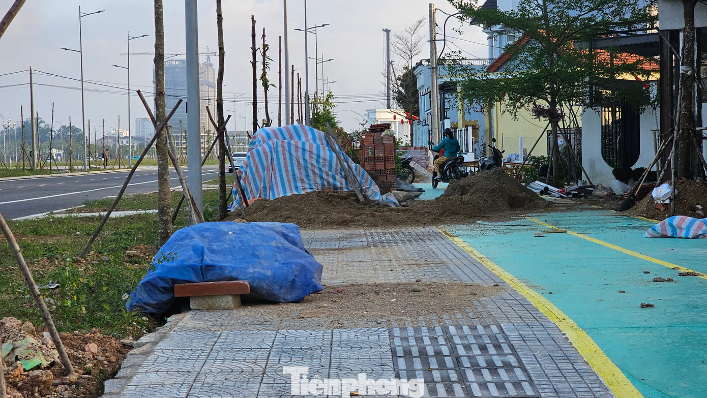 Dọc tuyến Võ Nguyên Giáp, nhiều đoạn đường dạo và làn xe đạp còn bị chiếm dụng làm nơi tập kết vật liệu xây dựng, tiềm ẩn nguy cơ mất an toàn.
