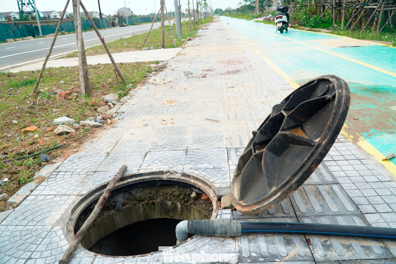 Tại khu vực gần nghĩa trang liệt sĩ phường Thủy Vân (cũ), người dân còn tự ý cạy nắp hố ga, đưa ống dẫn xuống hệ thống cống ngầm của dự án để lấy nước tưới cây cảnh, tạo “bẫy” nguy hiểm cho người dạo bộ.