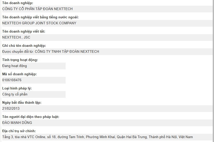Trụ sở chính của công ty có địa chỉ tại tầng 3, tòa nhà VTC Online, số 18 đường Tam Trinh, phường Minh Khai, quận Hai Bà Trưng, Hà Nội (nay là phường Vĩnh Tuy, Hà Nội). Người đại diện theo pháp luật kiêm TGĐ của NextTech là ông Đào Mạnh Dũng, không phải ông Nguyễn Hòa Bình.